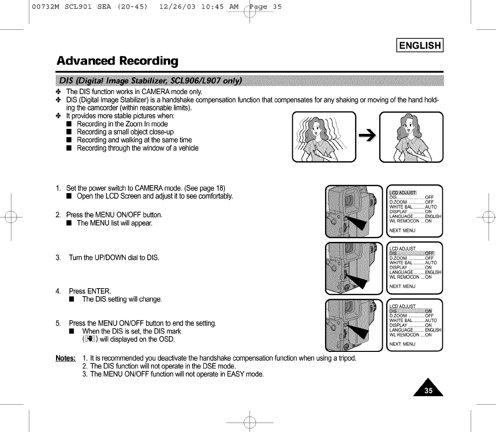 ÷ DIS (DigitalImageStabilizer)isa handshakecompensationfunctionthat compensatesforany shakingormovingof the hand hold-