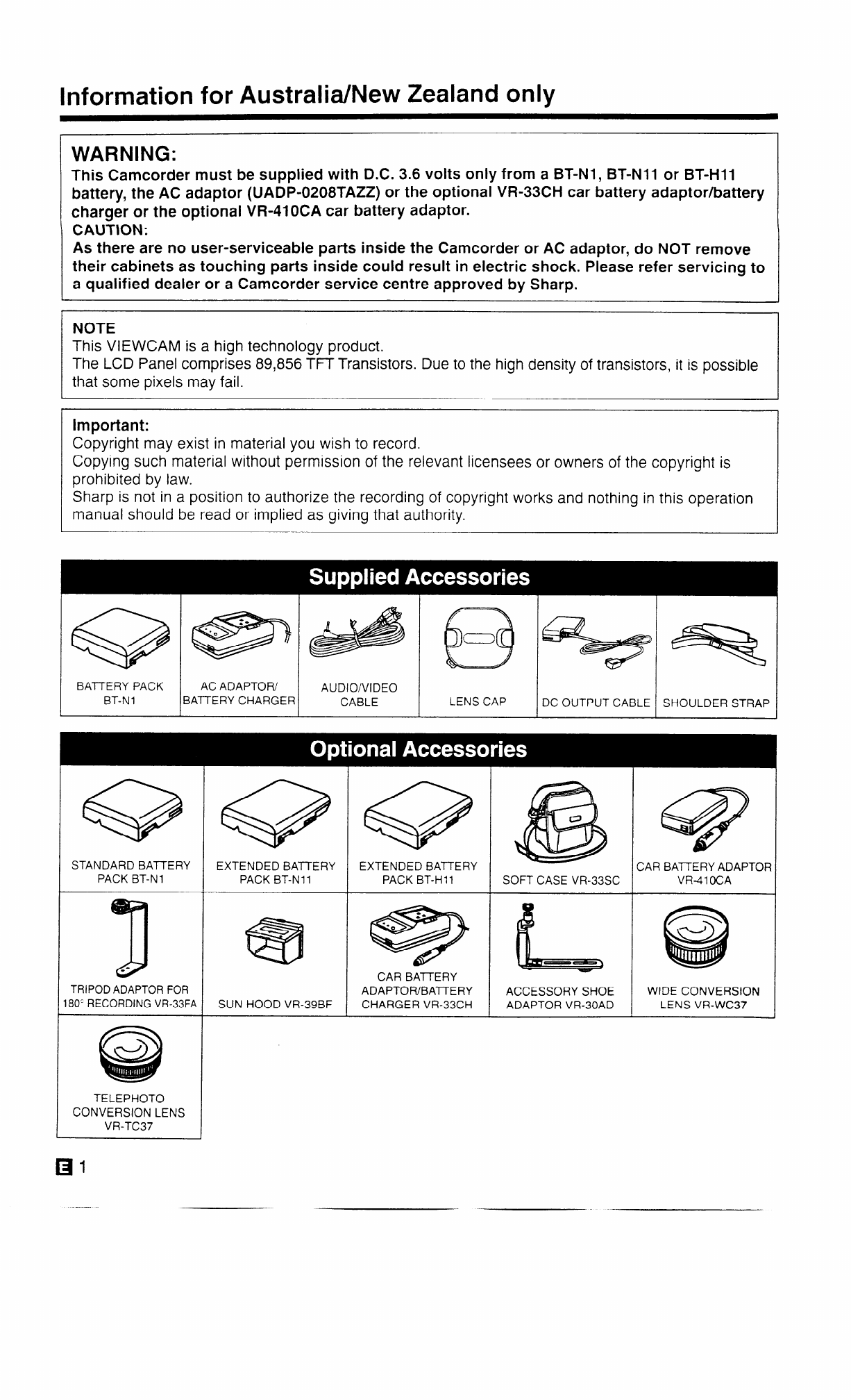 This Camcorder must be supplied with D.C. 3.6 volts only from a BT-Nl, BT-N11 or BT-H11