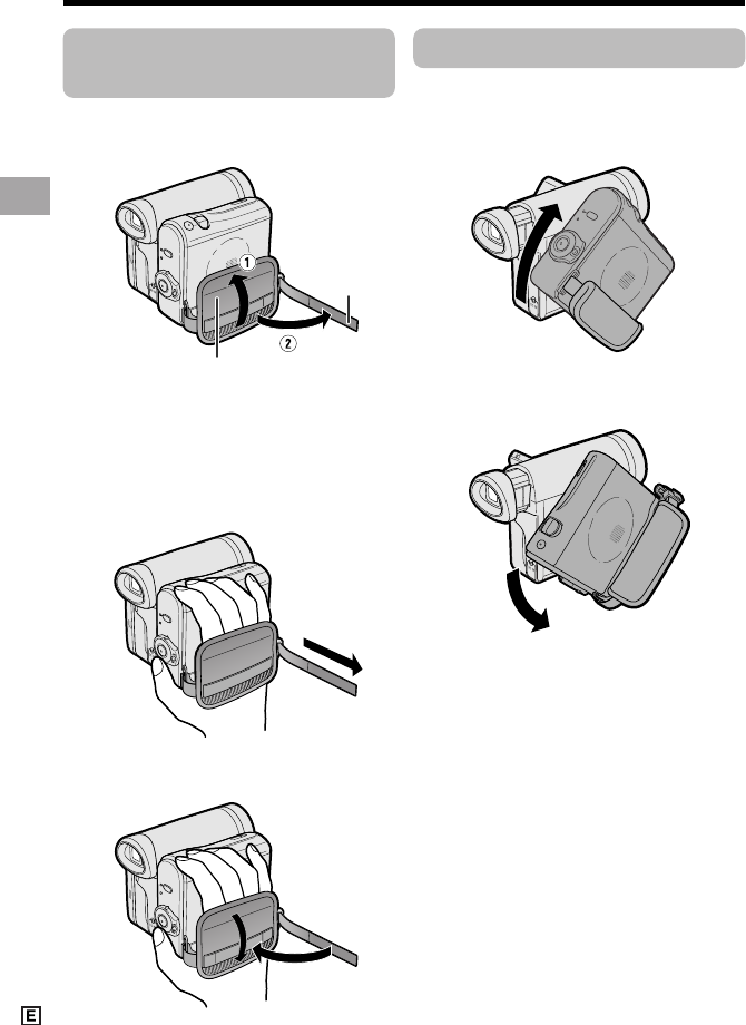 1 Open the hand strap flap (1) and grip