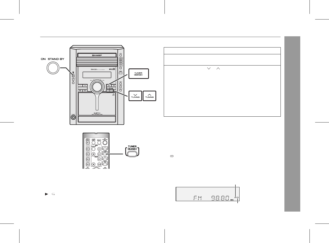 turns on and the "TUNER" function is activated.