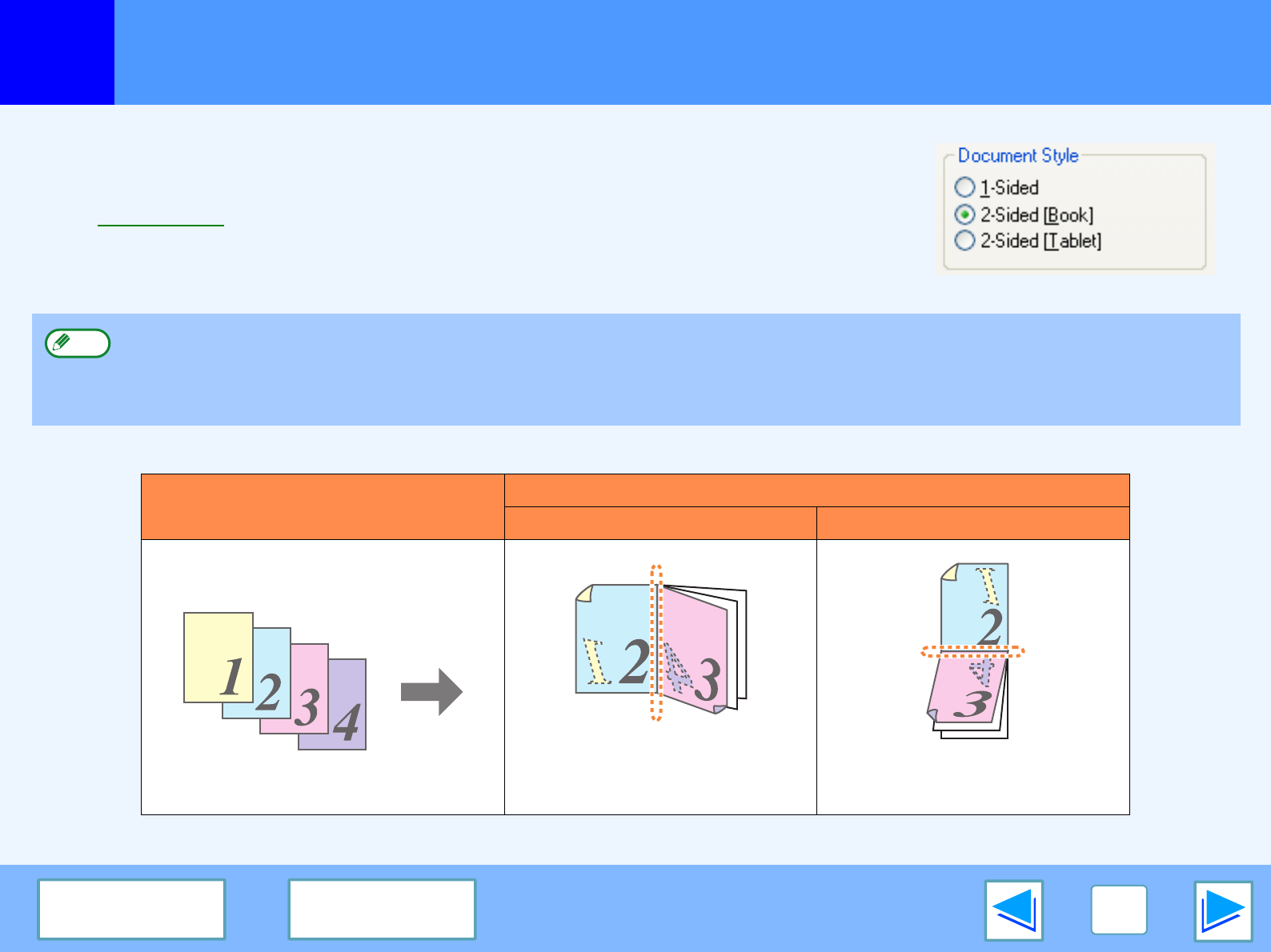 To use this function, open the printer driver setup screen and select "2-Sided (Book)" or