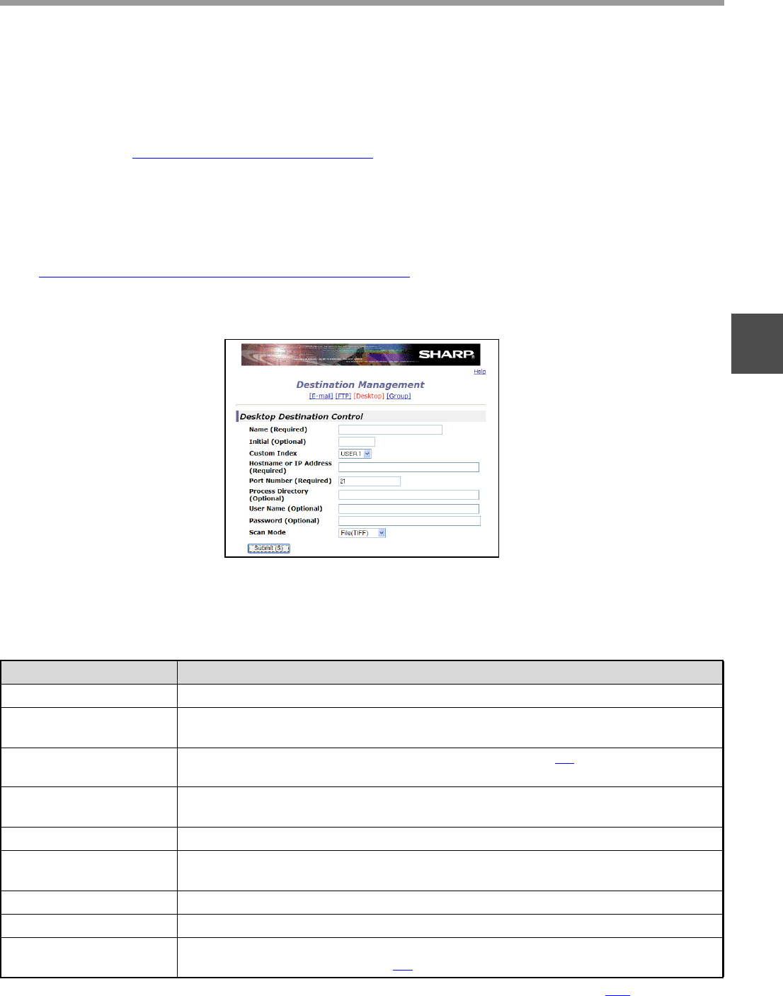 The following page for storing Scan to Desktop destination information appears when [Destination] is selected in the