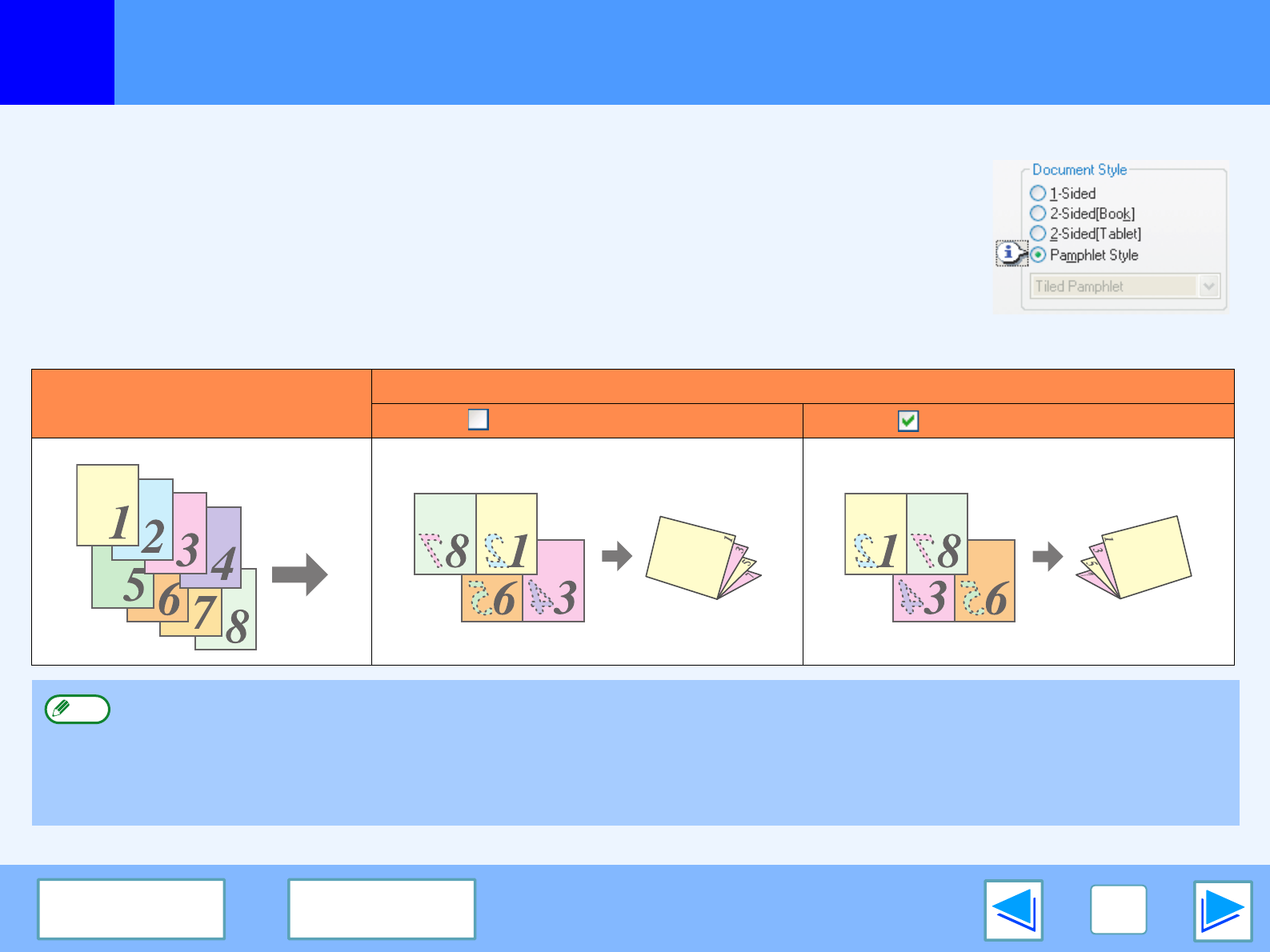 To use this function, open the printer driver and select "Pamphlet Style" in "Document Style" in the