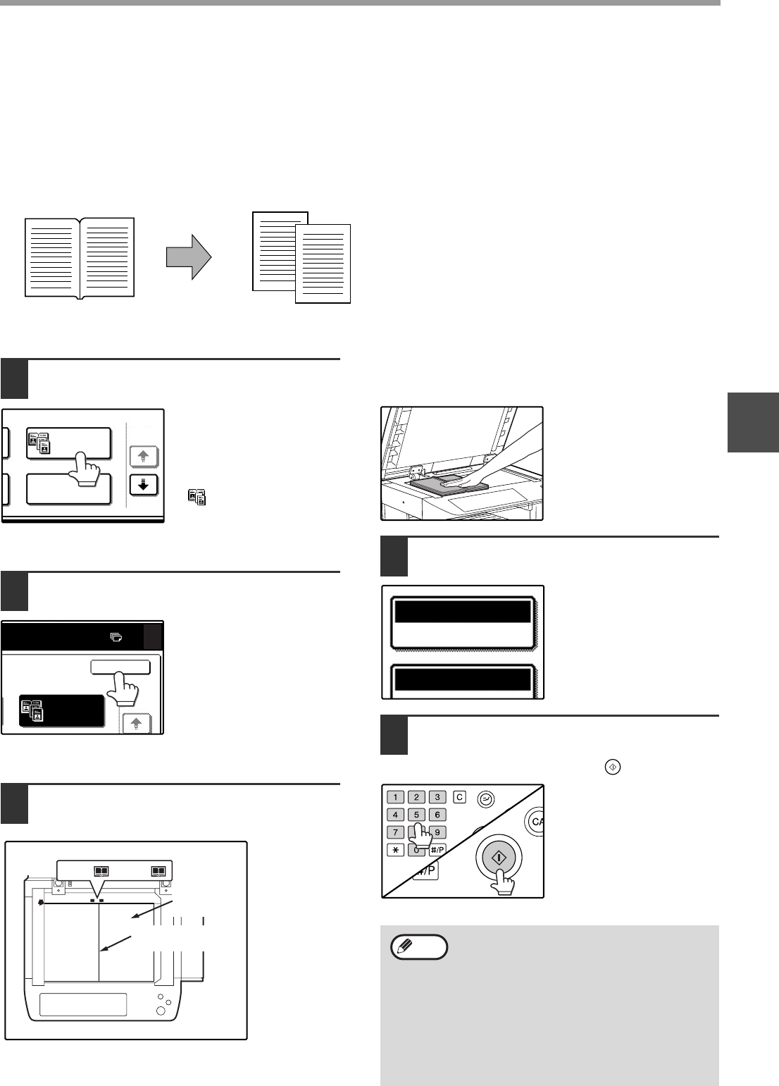 The dual page copy function produces separate copies of two adjoining pages on the document glass. It is