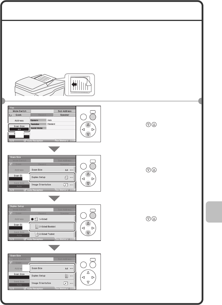 The procedure for faxing both sides of an A4 original at A3 size is explained