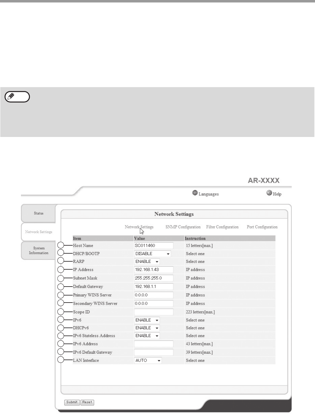 You can configure the network settings of the machine from the "Network Settings" tab of the Web page. The