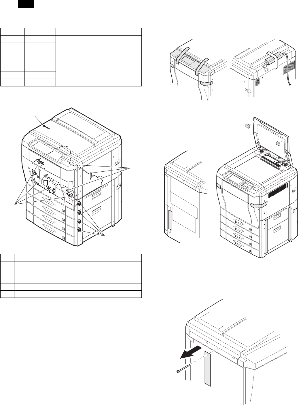 1) Remove the fixing tape and packing material from the copier body.