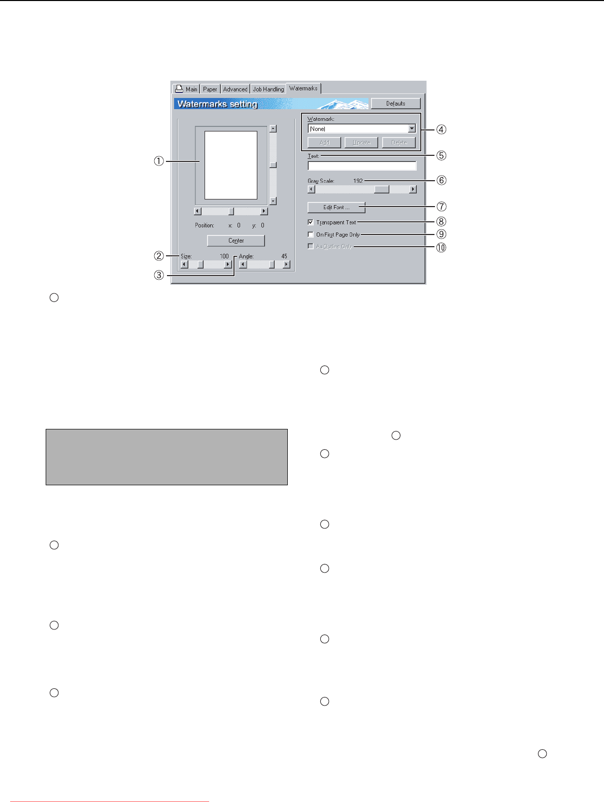 The following window appears when the [Watermarks] tab is clicked. The settings and buttons are explained below.