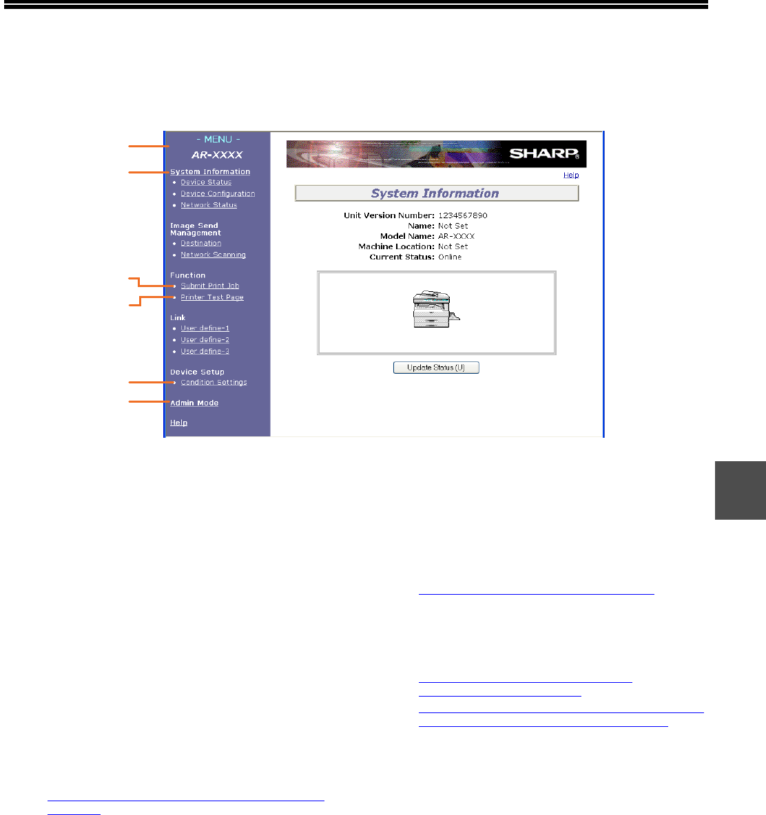 When you access the user Web pages in the machine, the following page will appear in your browser.