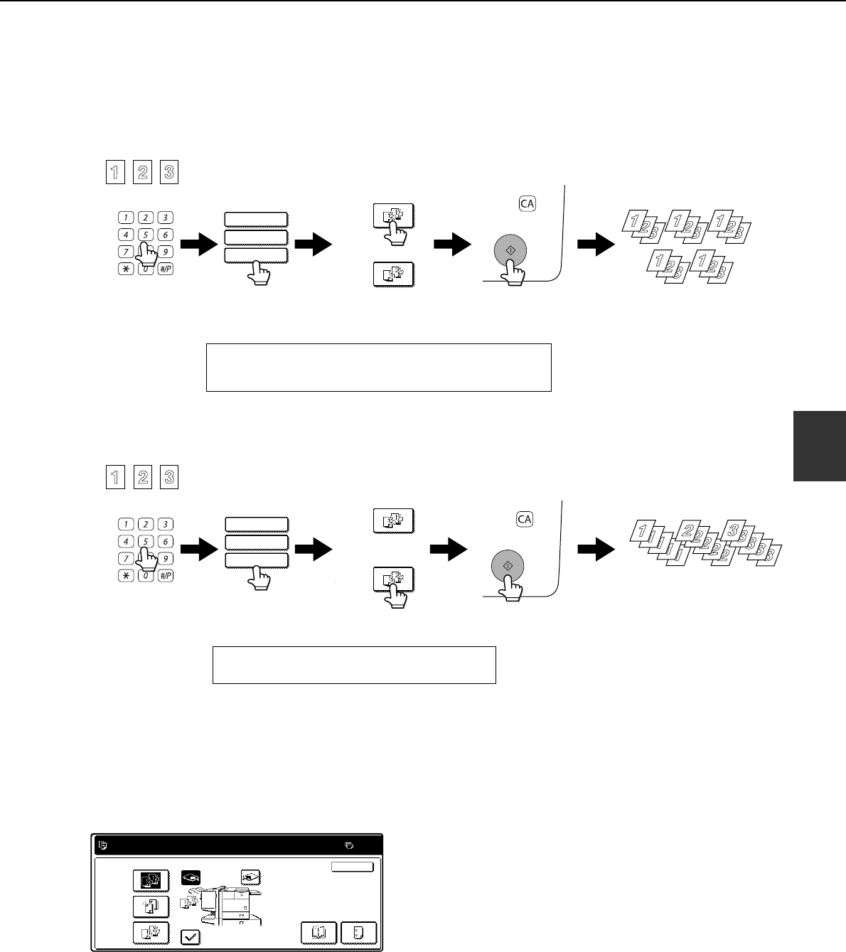 saddle stitch finisher. When the "CENTER TRAY" key is highlighted, output pages are delivered to the center