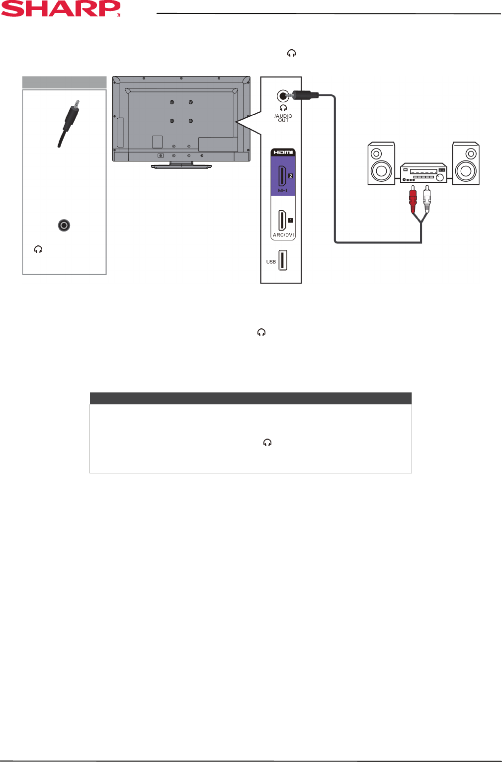2 Connect a 3.5mm audio cable (not provided) to the /AUDIO OUT jack on the side of your TV and to the