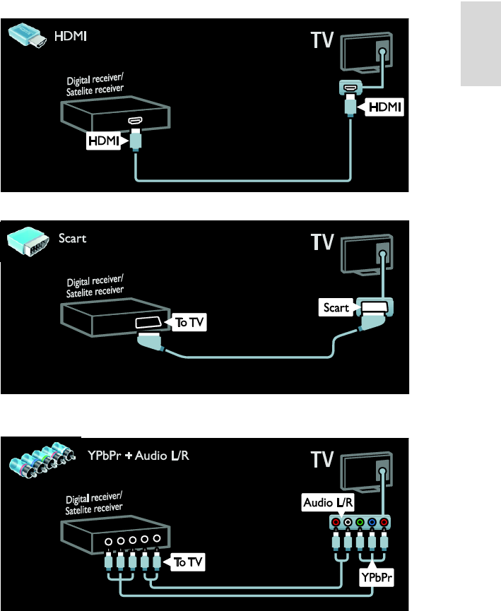 Connect the satellite or digital TV receiver with a SCART cable to the TV.
