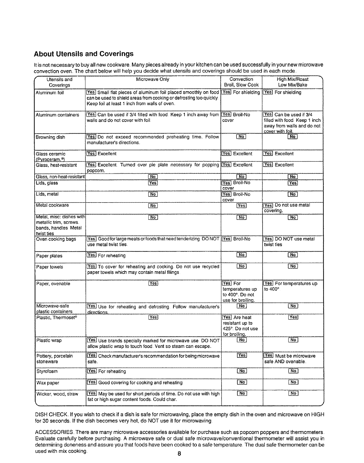 convection oven. The chart below will help you decide what utensils and coverings should be used in each mode.