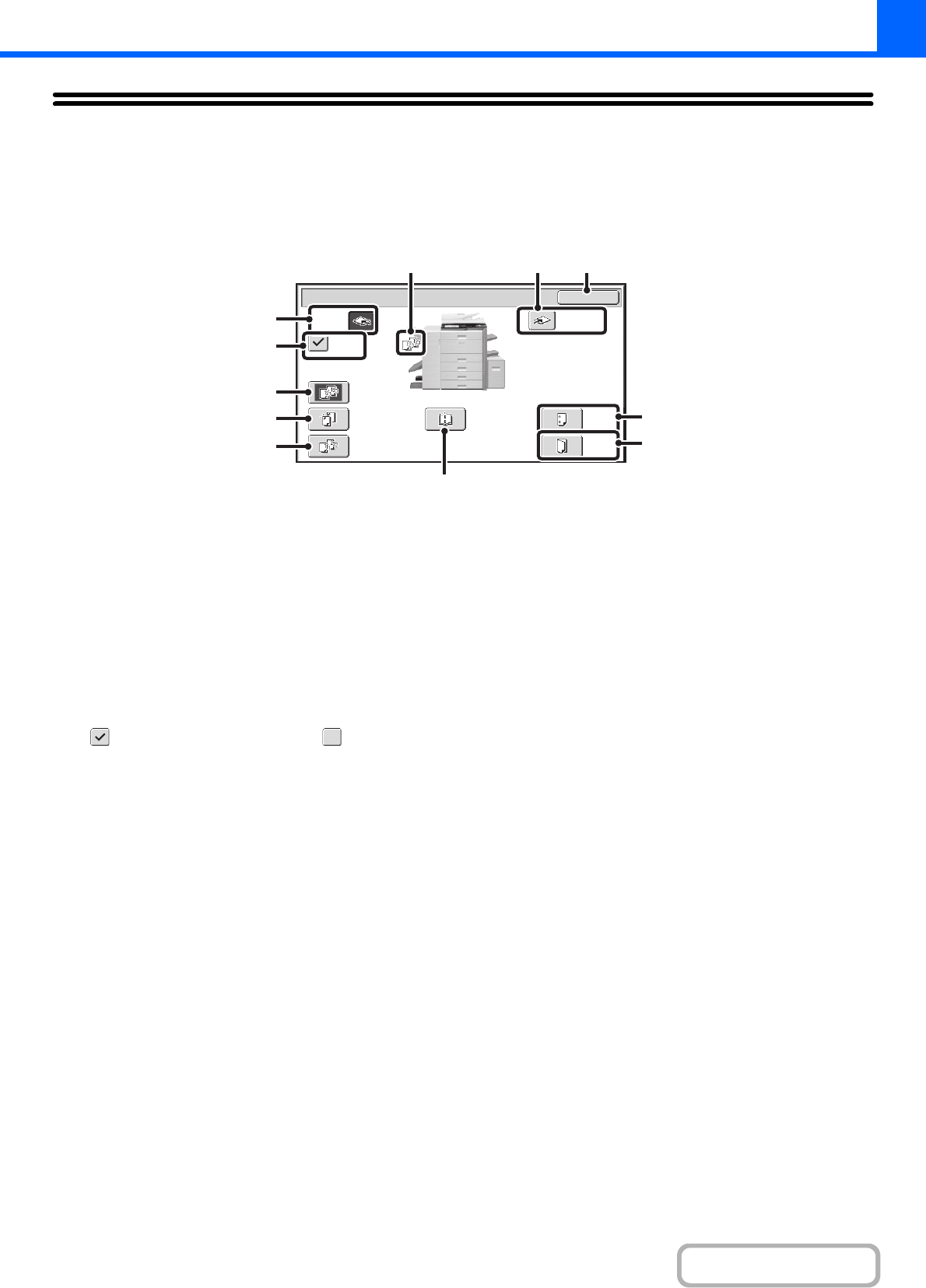 основного экрана режима копирования. Могут быть выбраны такие функции вывода, как сортировка, группировка, сдвиг