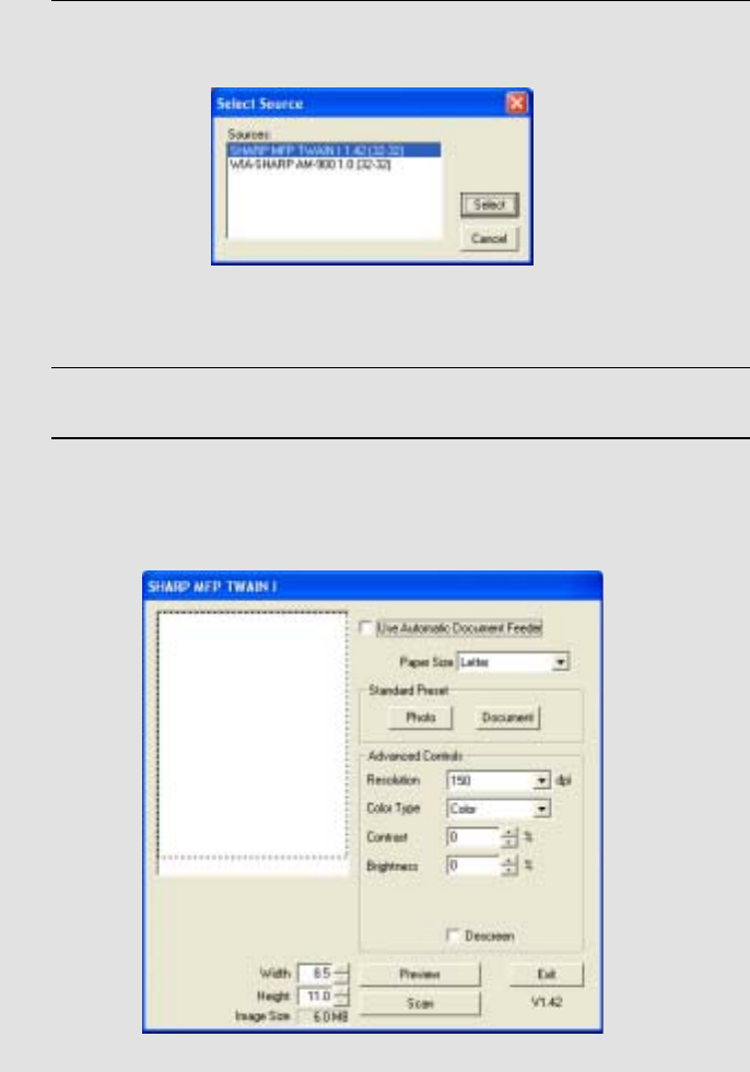 4 In the dialog box that appears, select “SHARP MFP TWAIN I” and click