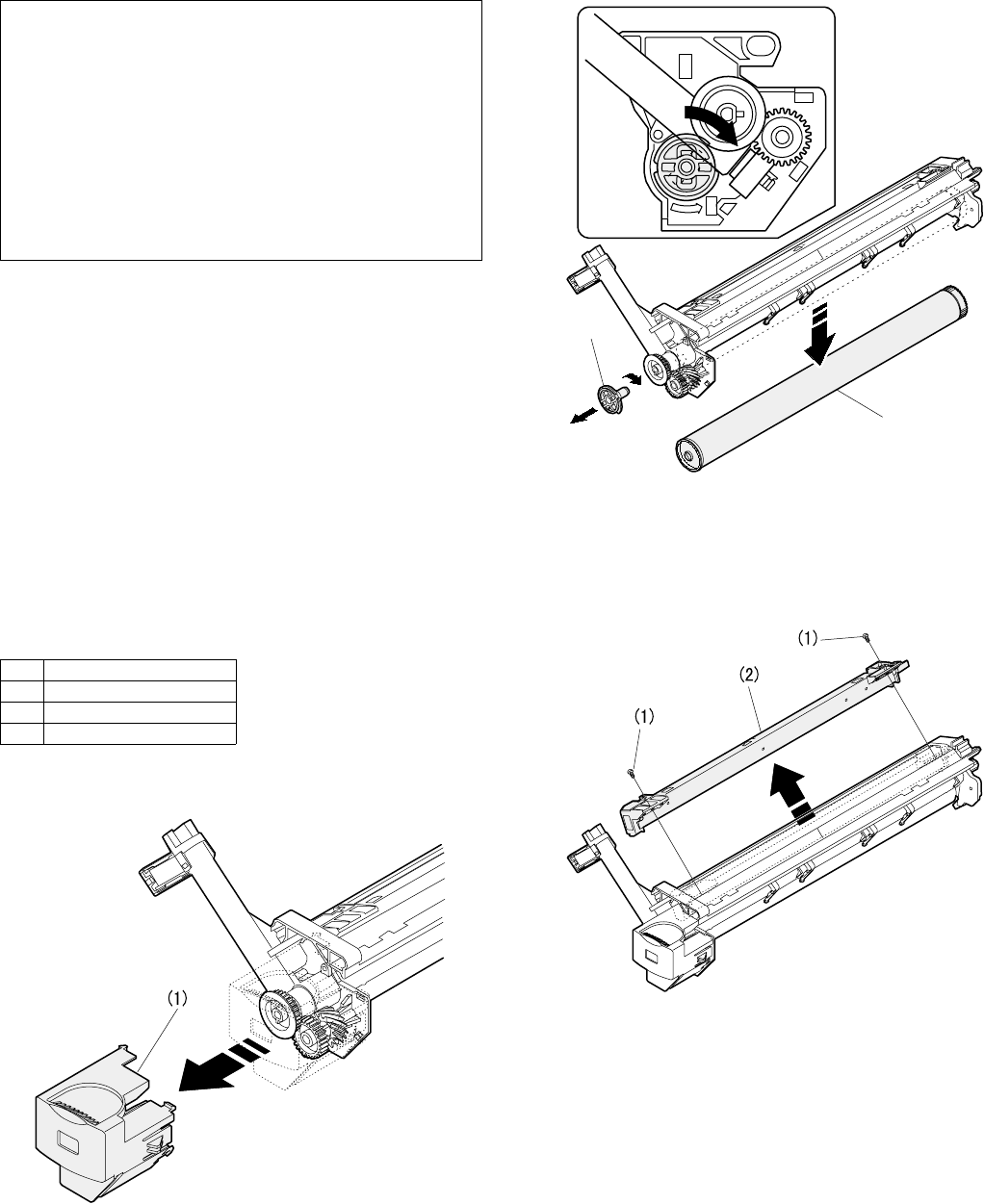 2) Remove the drum fixing plate and the photoconductor drum.