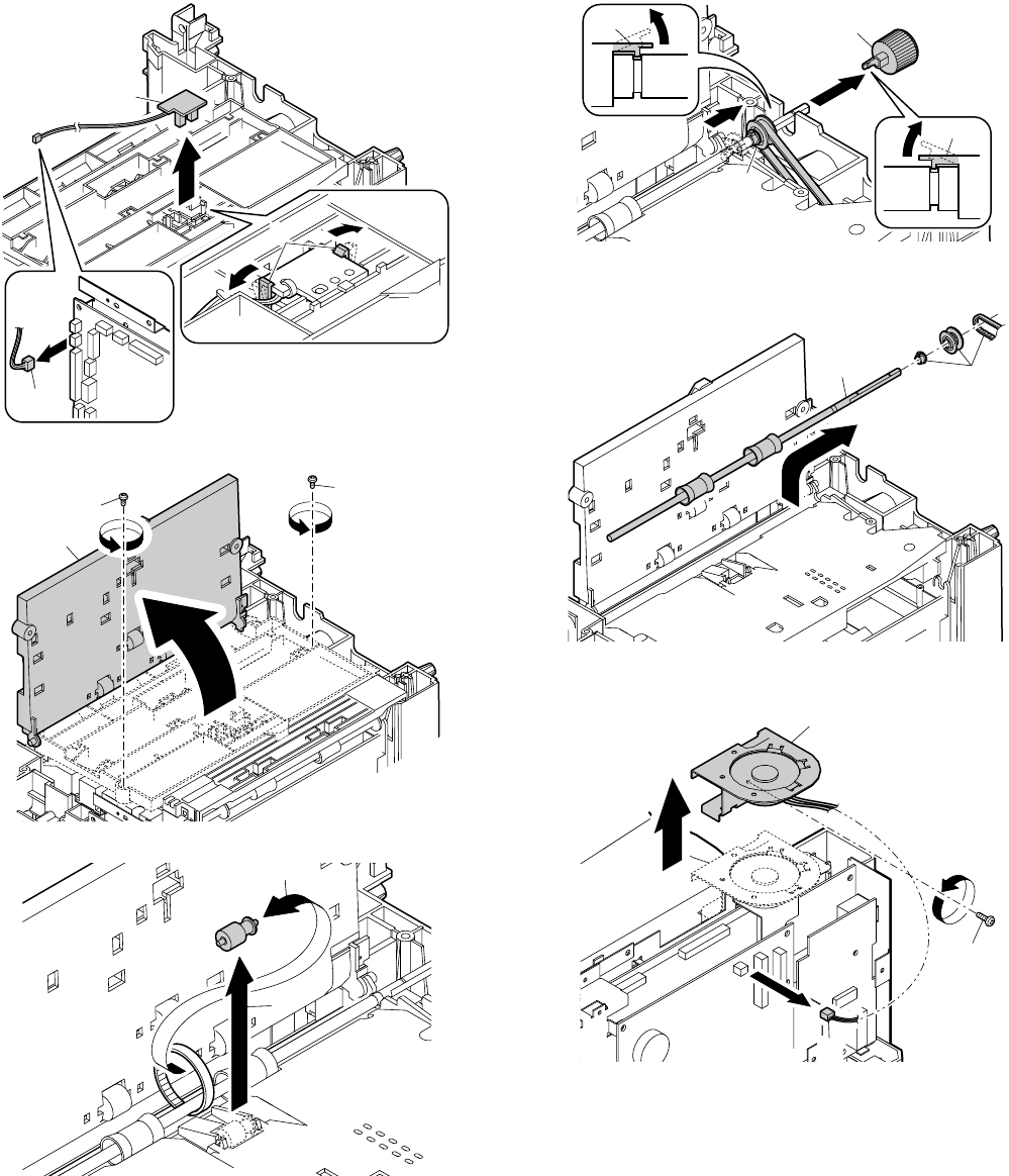 11) Remove the paper exit roller, and remove the belt, the pulley, and