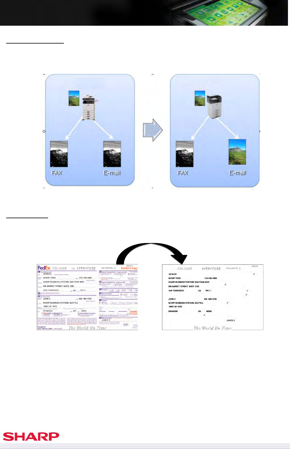 example, when sending data both to fax destination and email, users can send the data in B/W to Fax destination