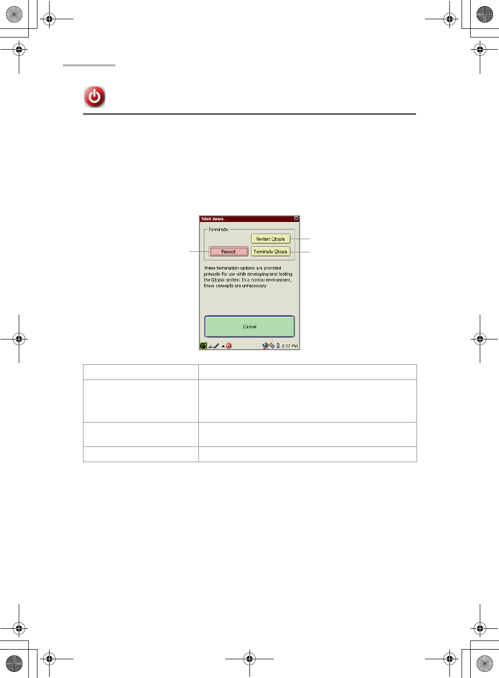 The Shutdown application allows you to restart the Linux system and the Qtopia