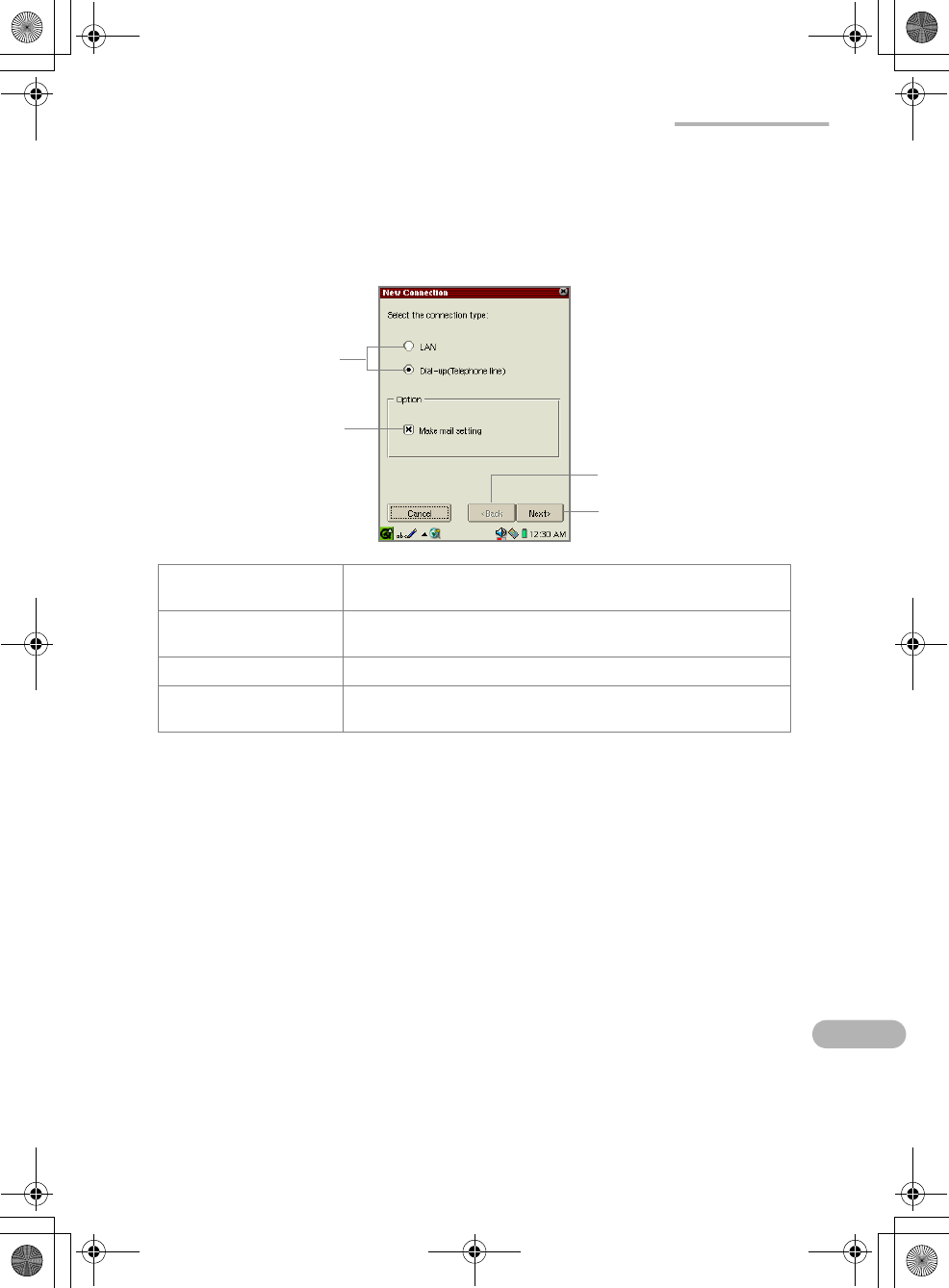 Next button Moves to the next screen (for dial-up or LAN) after saving