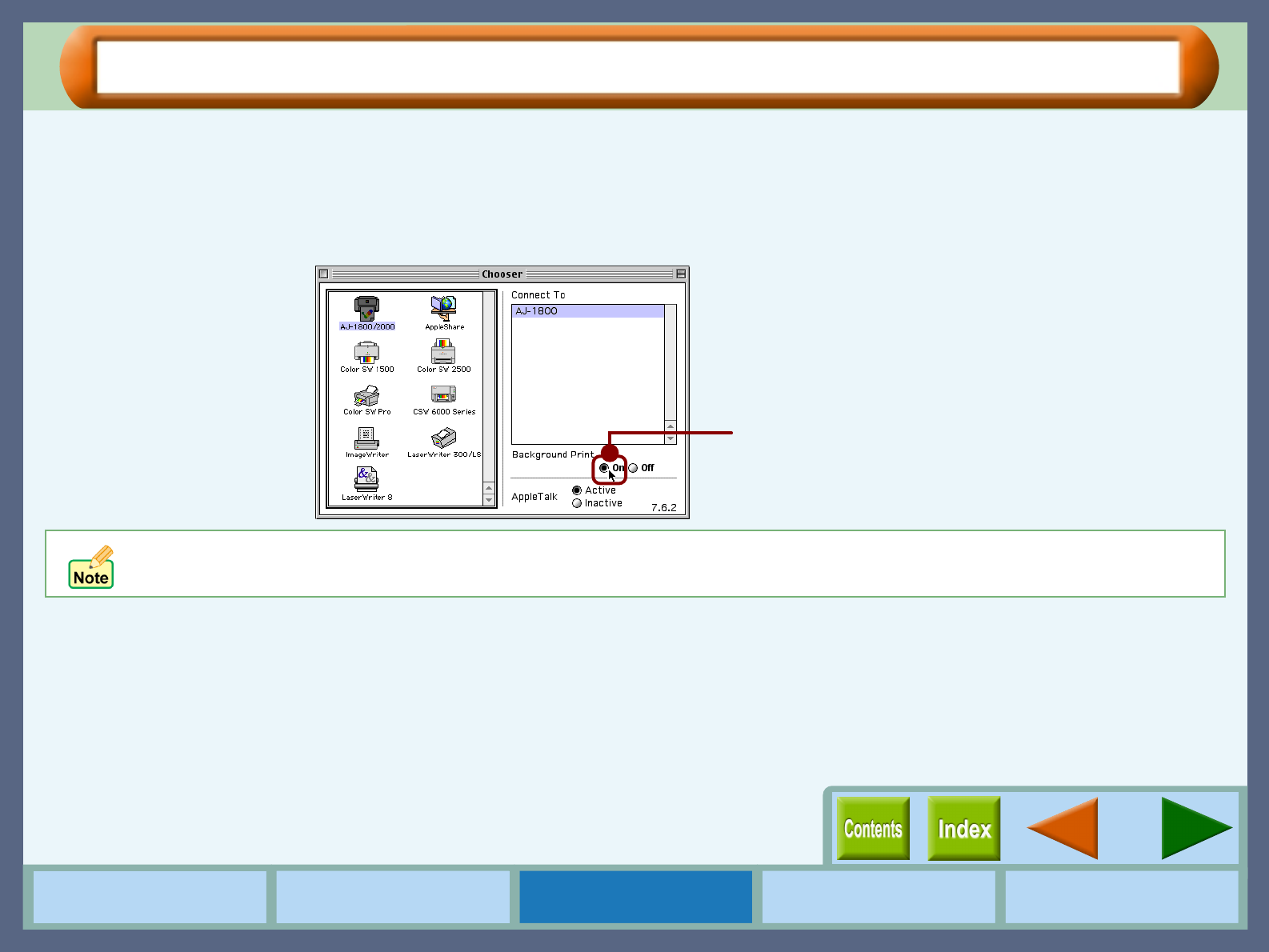 To setup background printing, select "Chooser" from Apple menu, select "AJ-1800/2000" printer icon in the box, and