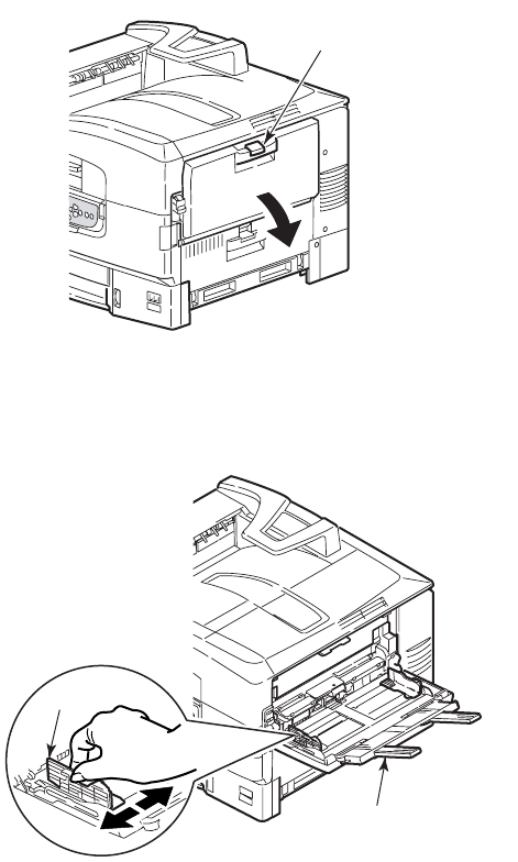 1. Squeeze the handle (1) and open the multi-purpose tray.