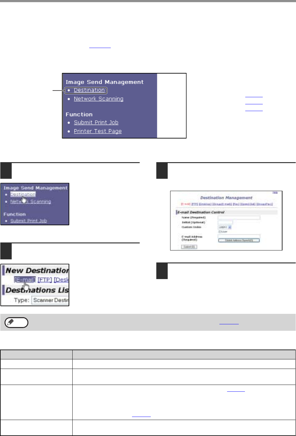 To store scanning destinations, click [Destination] in the Web page menu frame. This screen can also be used to