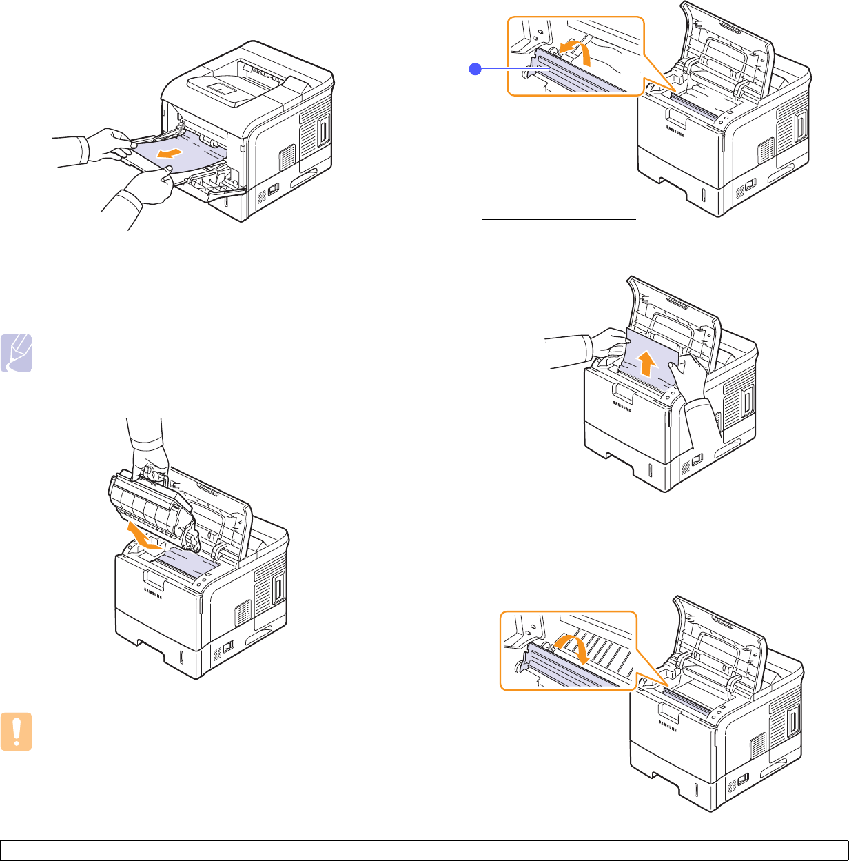 • The fuser area is hot. Take care when removing paper from the