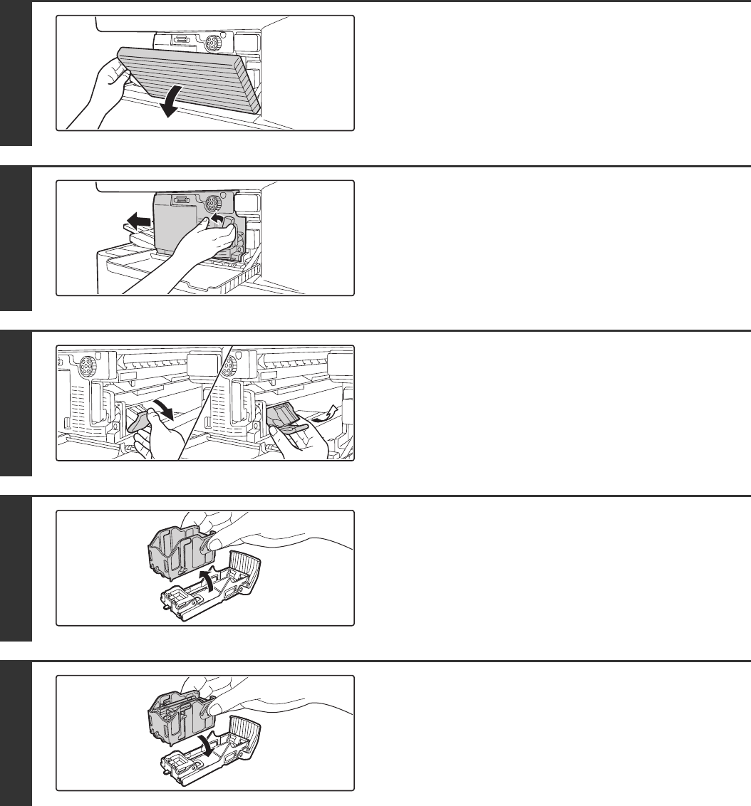 When the staple cartridge runs out of staples, a message will appear in the operation panel. Follow the procedure below