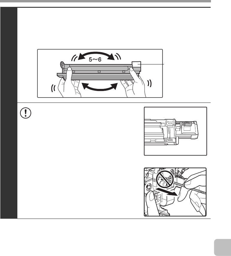 Hold the developer cartridge firmly as shown below and shake forward and