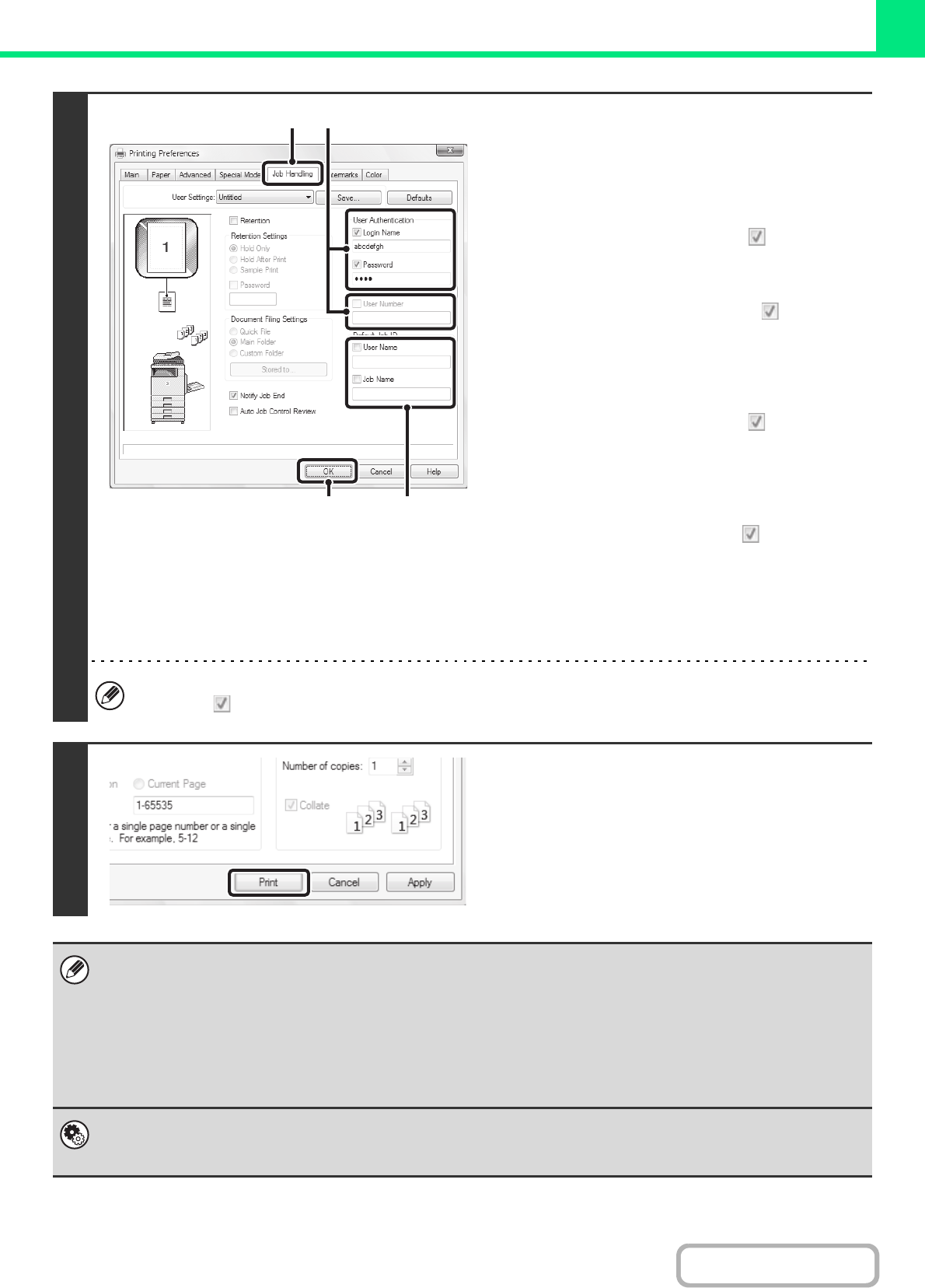 • When user authentication is enabled in the system settings (administrator), printing is possible without entering user