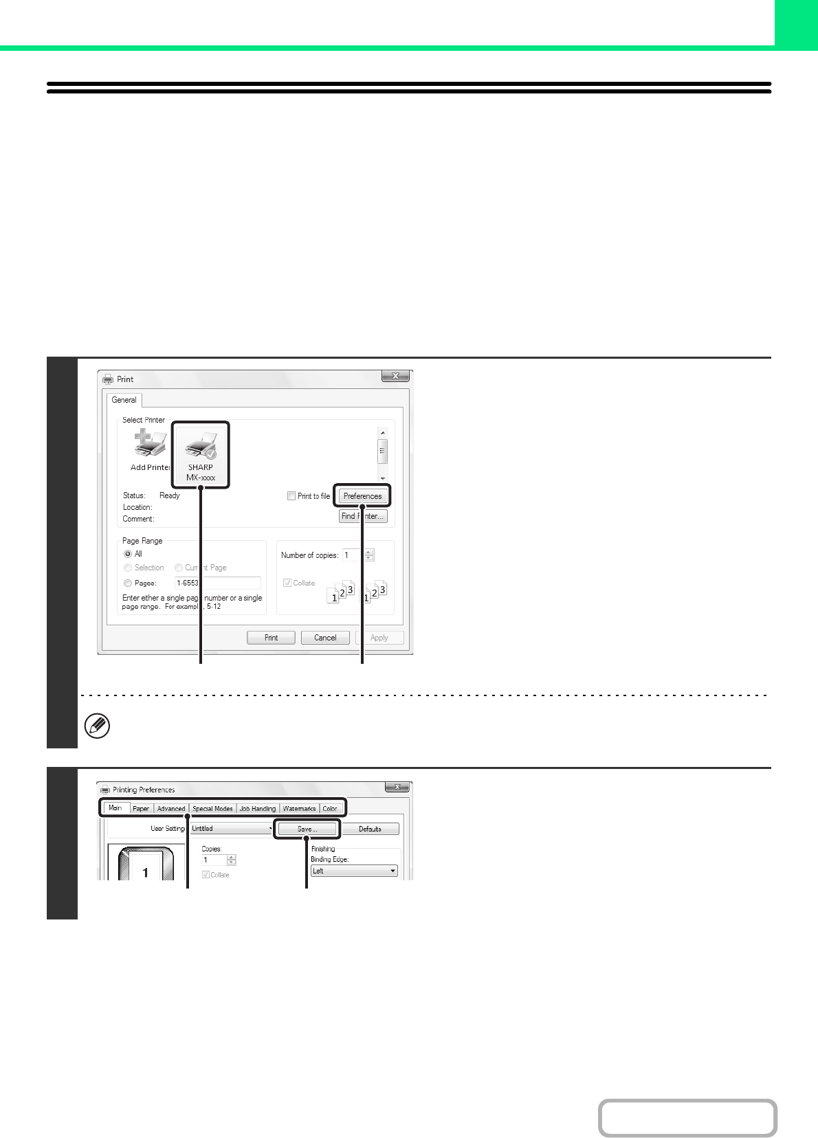 Settings configured on each of the tabs at the time of printing can be saved as user settings. Saving frequently used