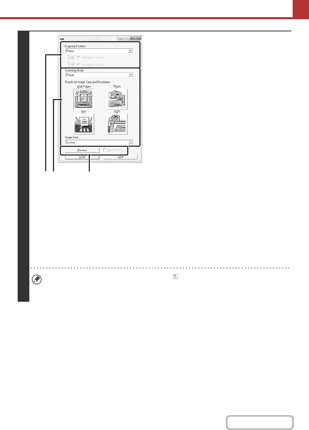 • For further information on the scan settings, click the button in the preview image screen of step 7 to