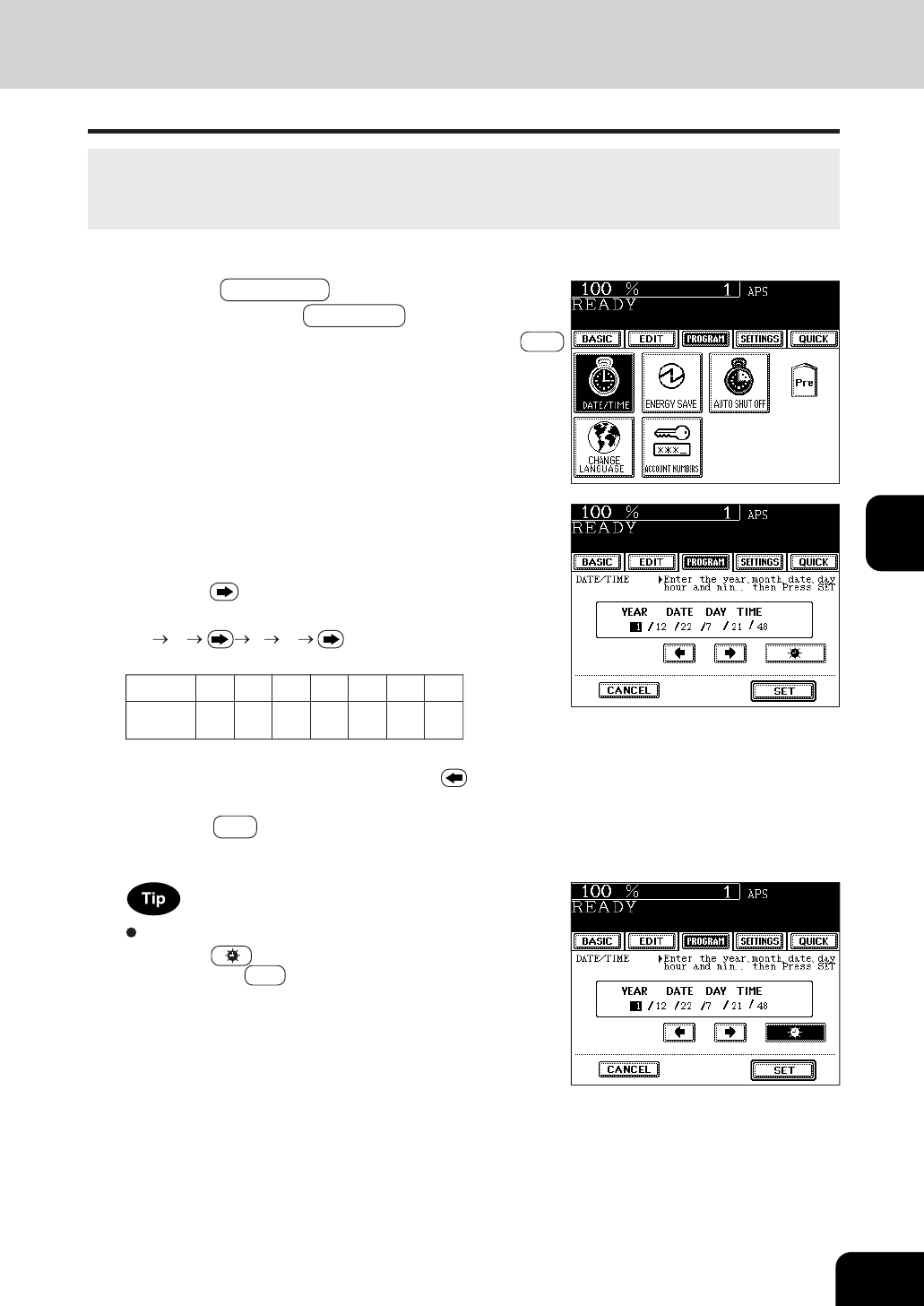 The clock built in to the copier can be set by entering the date, day of the week and time using the digital