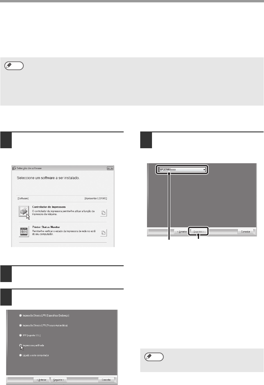 passos para instalar o controlador de impressora ou o controlador do PC-Fax nos computadores cliente.