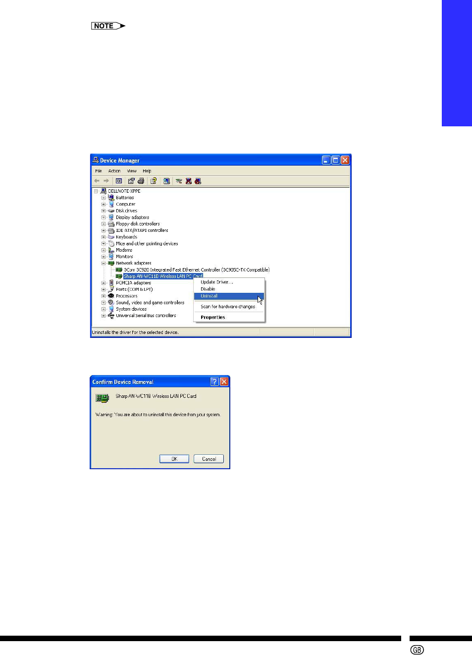 The “Sharp AN-WC11B Wireless LAN PC Card” driver should be uninstalled before