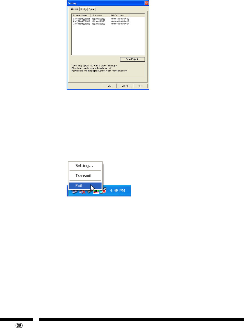 “Projector” tab For selecting the destination projector