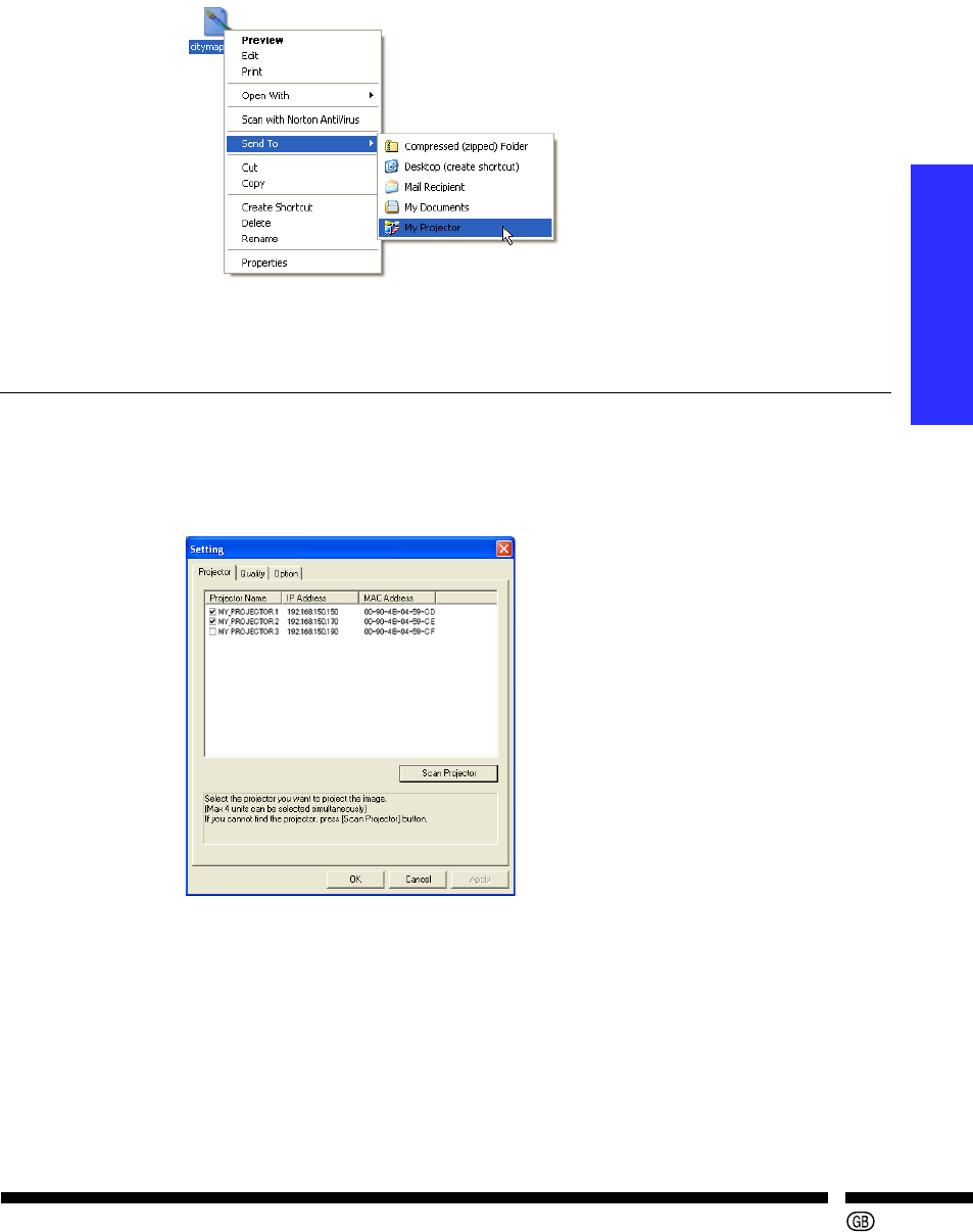“Send To”, and then “My Projector”.