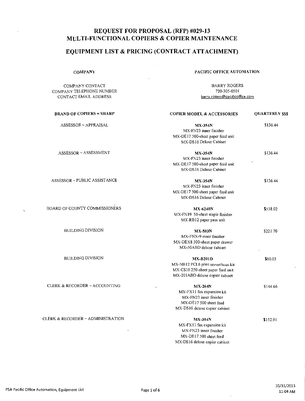 EQUIPMENT LIST & PRICING (CONTRACT ATTACHMENT)
