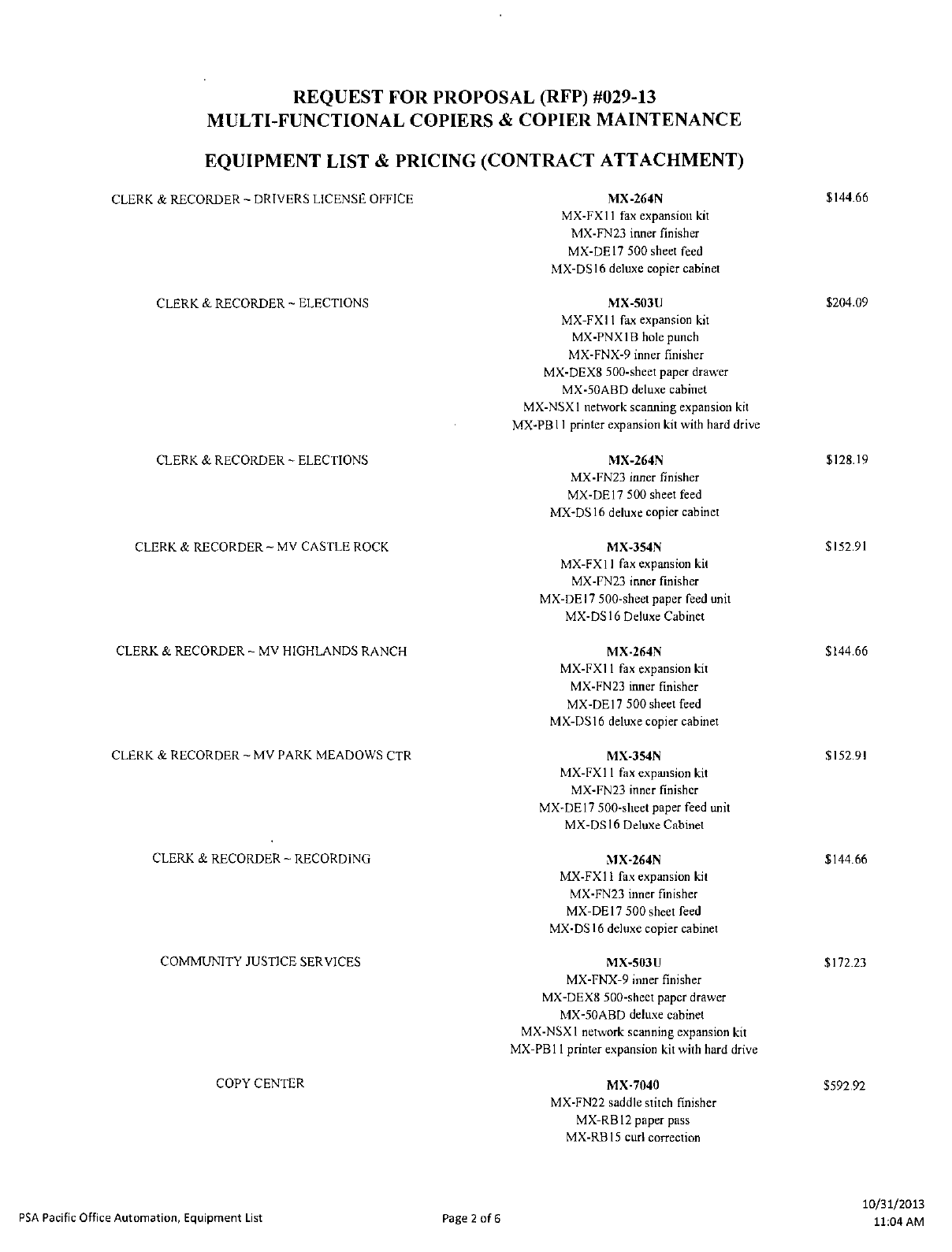 EQUIPMENT LIST & PRICING (CONTRACT ATTACHMENT)