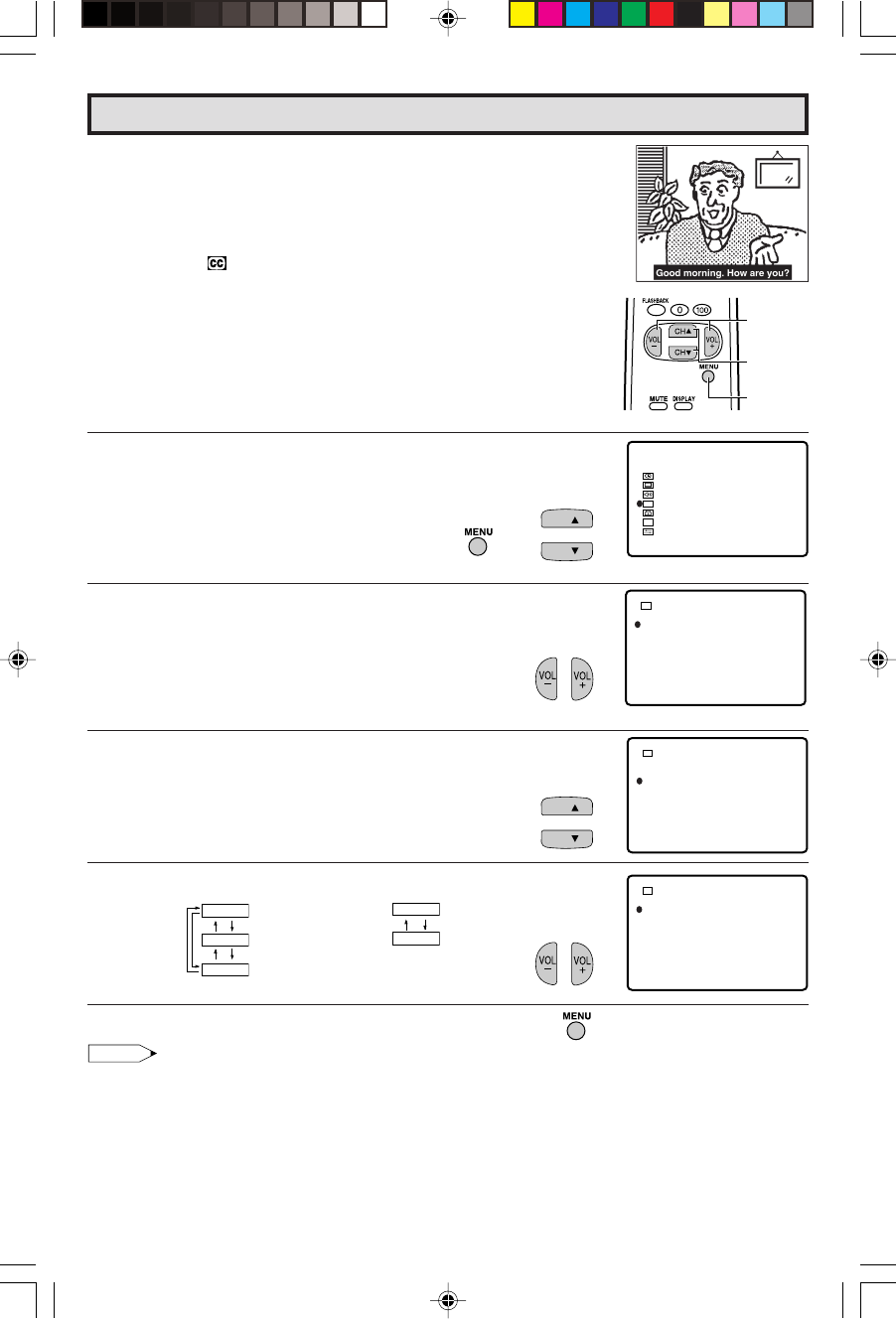 • If a broadcast contains CLOSED CAPTION and the MUTE button is pressed, the set enters CAPTION