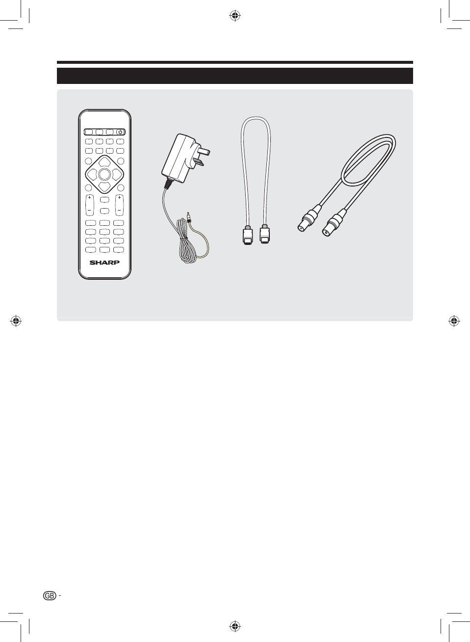 Remote control unit ( x 1) Power Adaptor ( x 1) HDMI Cable ( x 1) RF Cable ( x 1)