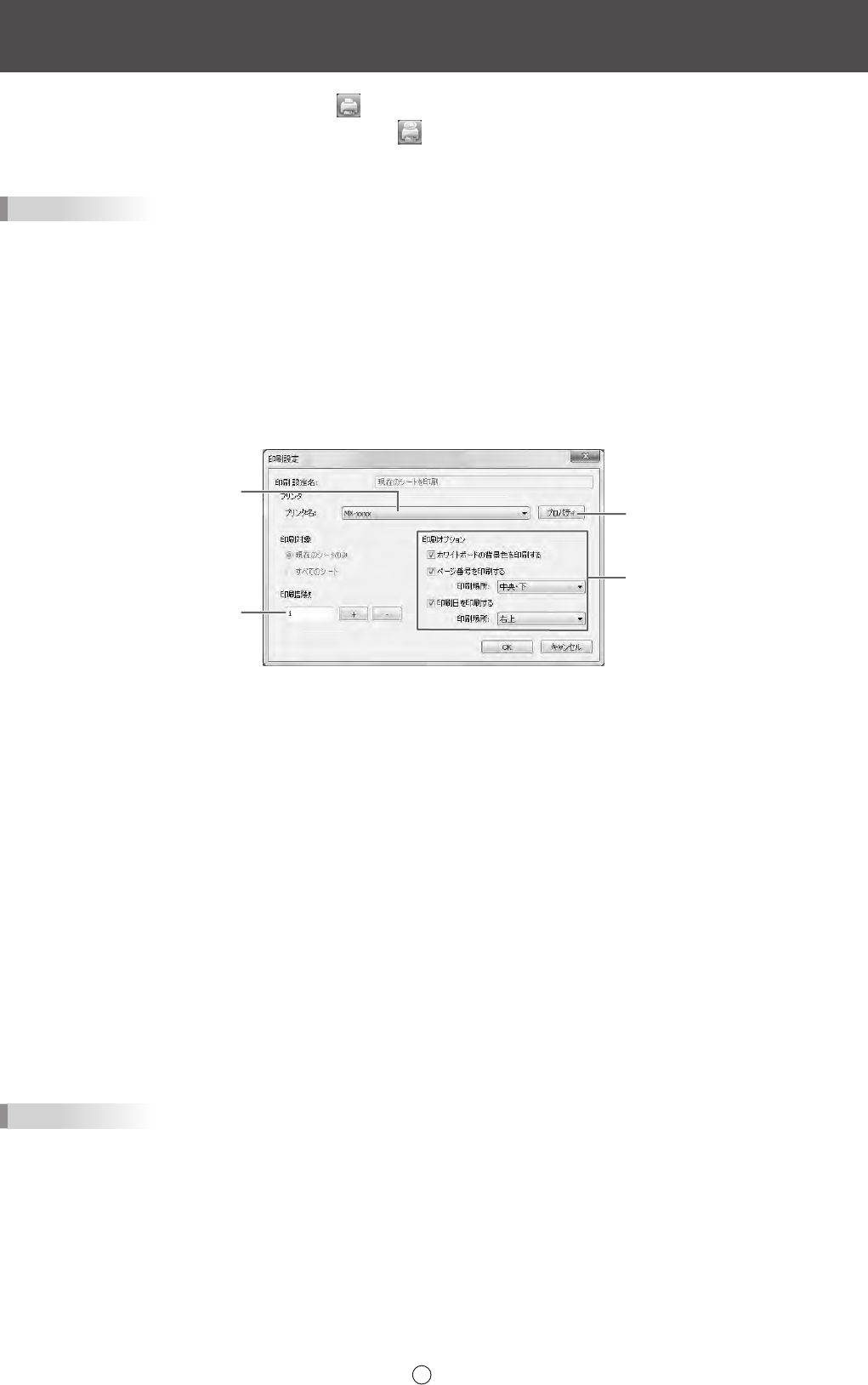 ホワイトボードの背景色を印刷する :ホワイトボードの背景に設定した色を印刷する場合は、チェックします。