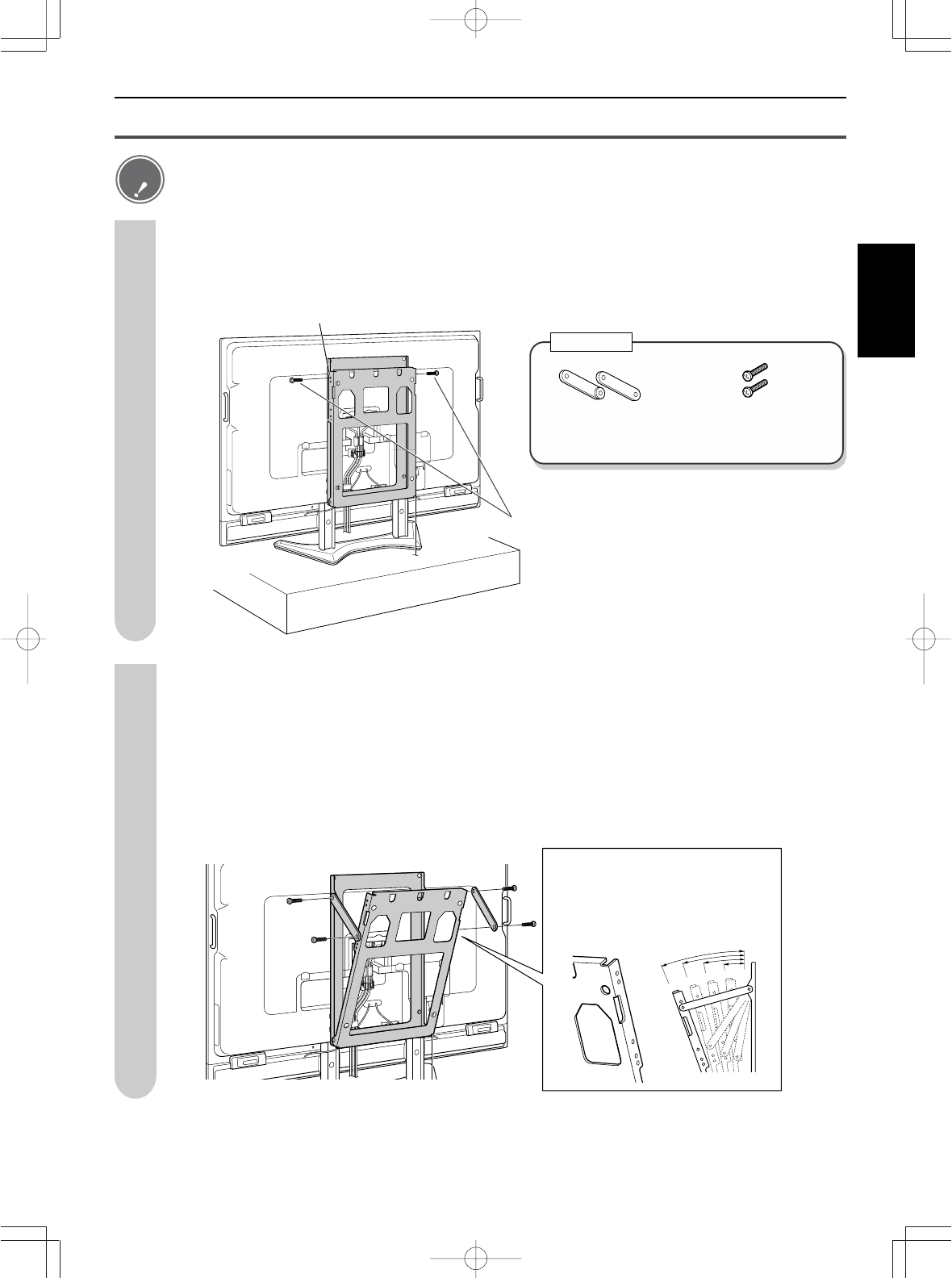 For the screws, use the included angle setup bracket screws (M8 length: 15 mm × 2 screws)
