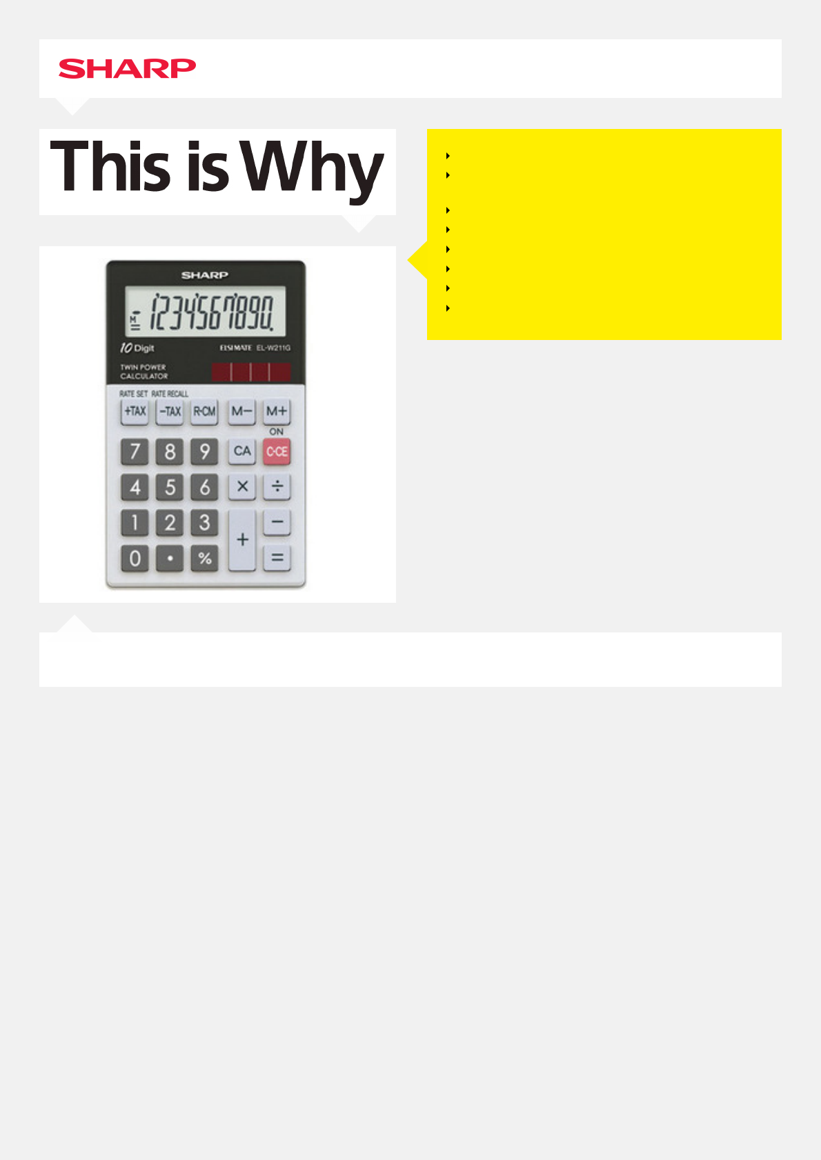 ELW211GBGYAMPIO DISPLAY A 10 CIFREDOPPIA ALIMENTAZIONE (BATTERIA ESOLARE)CALCOLO IMPOSTASEPARATORE OGNI 3 CIFRE3 TASTI MEMORIATASTO PERCENTUALECOSTANT